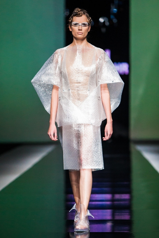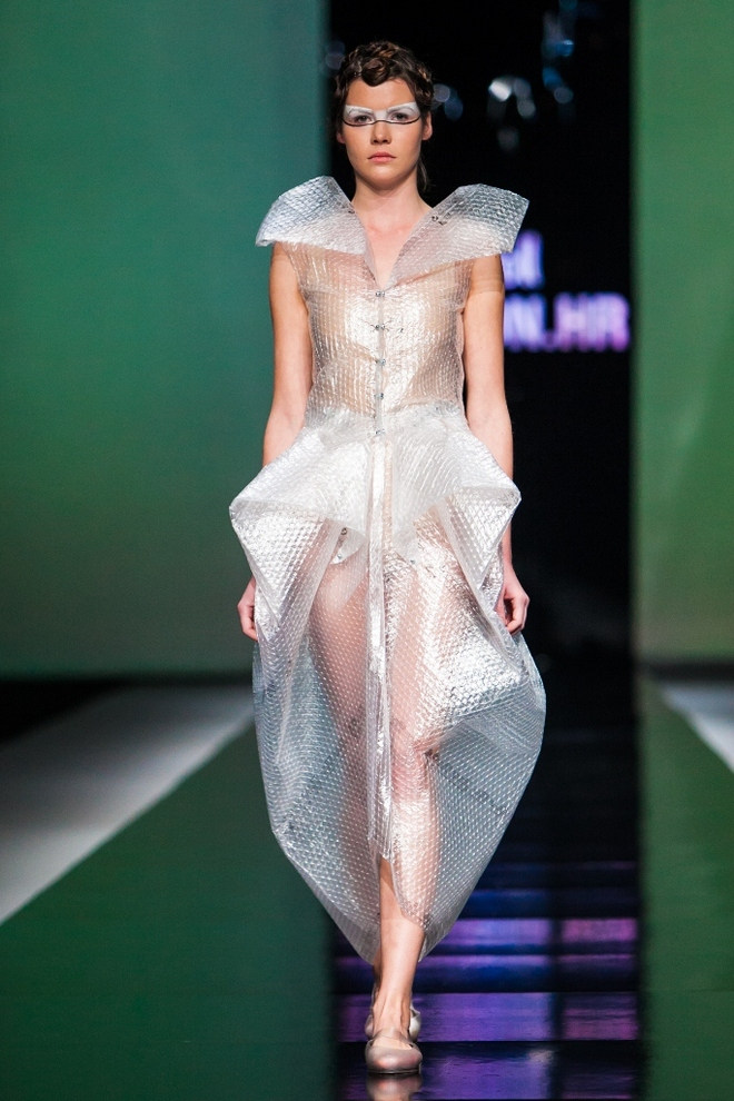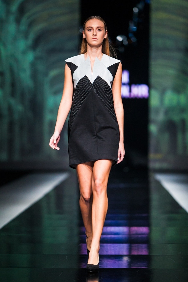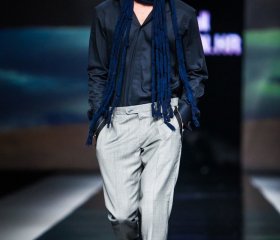 Ugodno iznenađenje posljednje večeri ovosezonskog Fashion.hr-a bio je student treće godine Tekstilno-tehnološkog fakulteta Silvio Ivkić koji ujedno radi i kao vizažist za Illamasqu (make-up sponzora ove manifestacije), čiji je estetski izričaj vrlo mračan, gothic i minimalistički. Uz oglavlja od šiba obojenih u crno, Silvio je osmislio nosive kombinacije transparentnih i mat materijala (riječ je o umjetnoj koži) koje je ponegdje rezao u linije i ručno spajao kako bi dobio laganu dinamiku pri pokretu, ali i 3D efekt. Nije to bilo ništa dramatično, no dalo je kreacijama na volumenu, kako bi one postale dominantne i efektne.